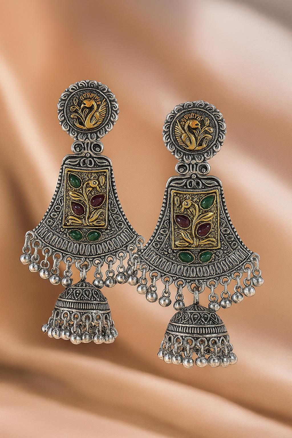 These antique oxidised silver jhumka earrings are beautifully crafted with intricate temple-style motifs, highlighted with green and maroon stone embellishments and delicate ghungroo drops. The design combines elegance with traditional artistry, making them a perfect statement accessory.