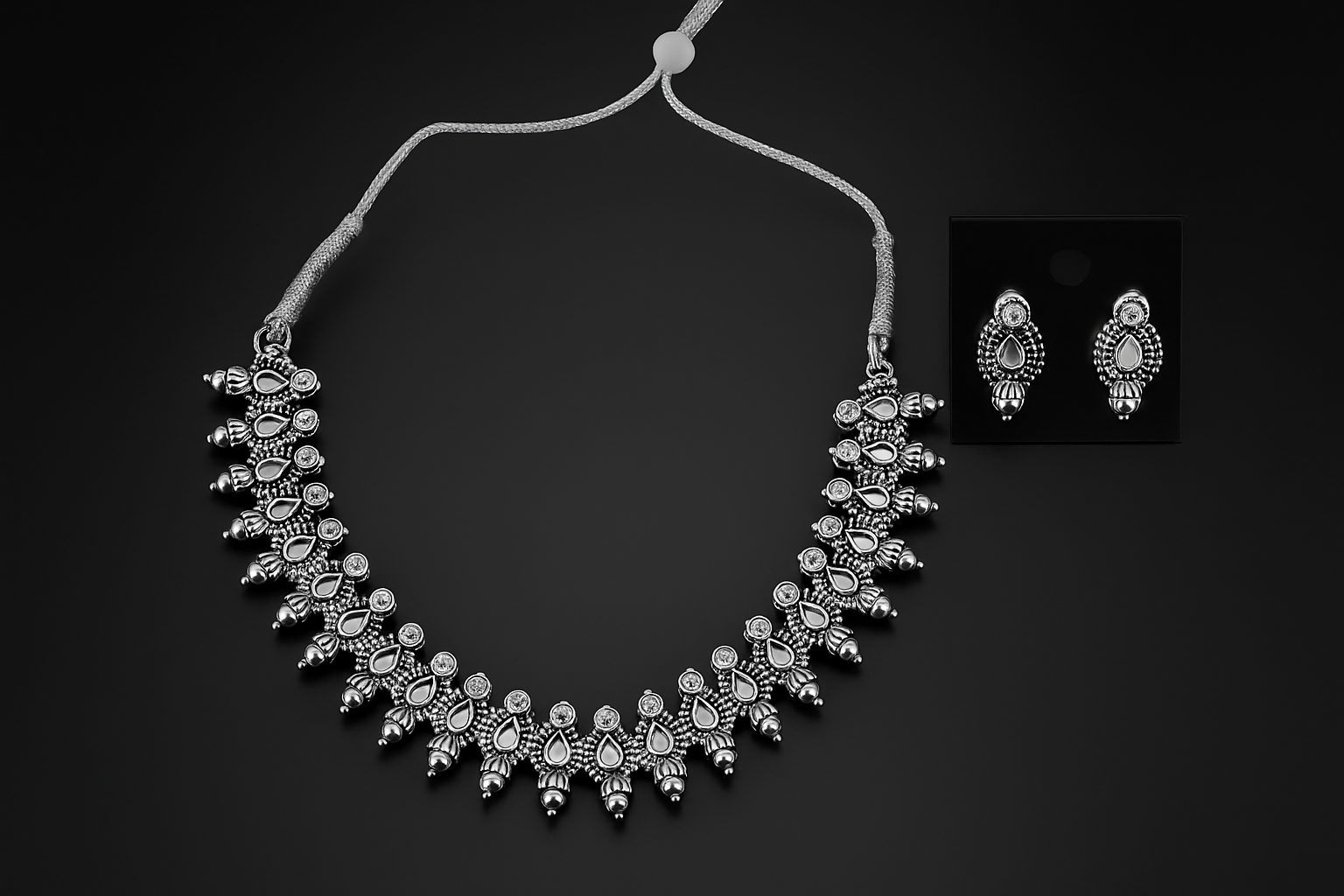 Complete your Navratri look with this stunning oxidised silver necklace set, designed with intricate detailing and paired with matching earrings. The antique finish adds a traditional charm that perfectly complements your festive outfits — whether it’s a ghagra, saree, or Indo-fusion attire. Lightweight, stylish, and eye-catching, this set is ideal for Garba nights and Navratri celebrations.