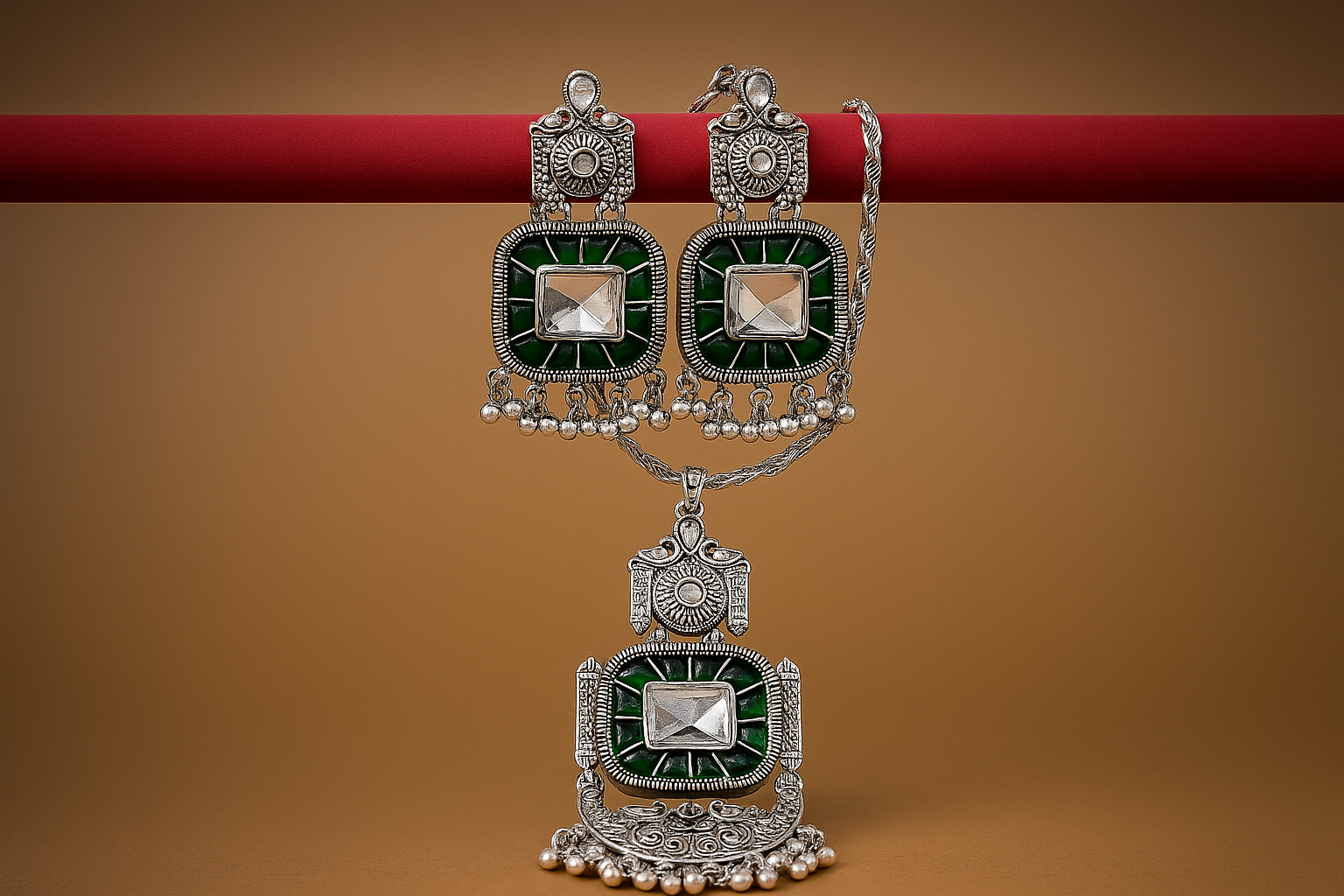 Make a bold style statement with this stunning oxidized silver necklace and matching earring set, beautifully crafted with intricate detailing and a striking green stone centerpiece. The antique finish adds a touch of tradition, while the sparkling design makes it perfect for festive occasions, weddings, or cultural celebrations.