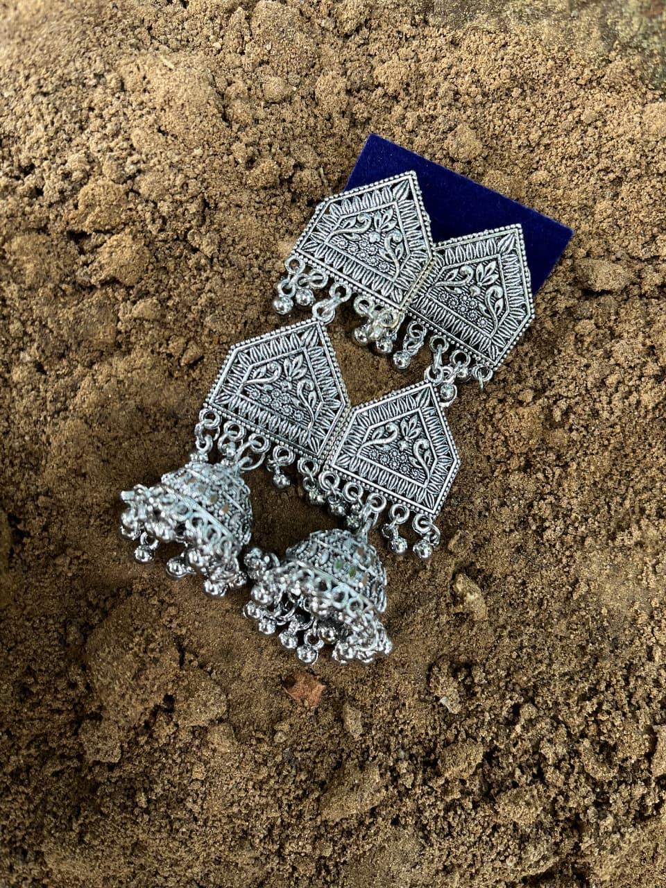 Description: This captivating image displays a pair of stylish oxidized silver drop earrings, combining leaf and floral designs with classic jhumka elements. The jewelry is presented in a hand showcasing intricate mehndi, against a natural, green outdoor setting with pops of pink.